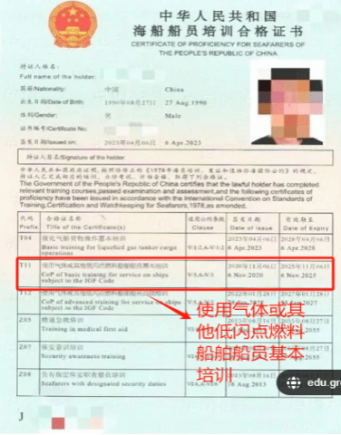 T11 使用气体或者其他低闪点燃料船舶船员基本培训合格证:是针对那些在使用气体或其他低闪点燃料船舶上工作的船员所需持有的基本培训合格证书。这种船舶通常使用液化天然气(LNG)、液化石油气(LPG)或其他低闪点燃料作为动力源。有效期通常为5年。