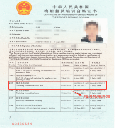 Z06船上医护培训合格证:是航海技术专业高级船员培训中的一种专业证书。主要针对船员在船上的医疗急救知识和技能进行培训,确保船员在紧急情况下能够提供基本的医疗援助和救助。