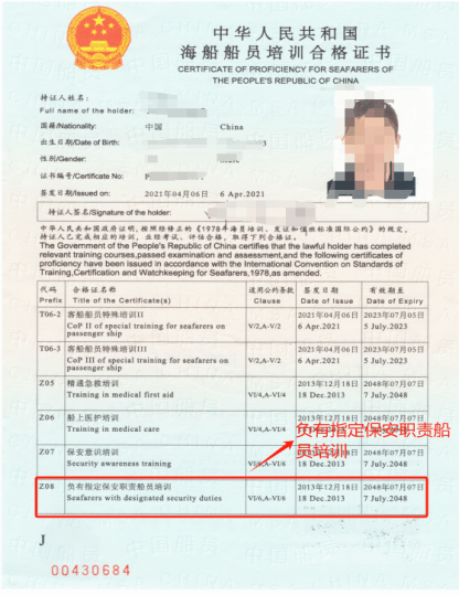 Z08负有指定保安职责船员培训合格证:主要是为那些在船舶上负有指定保安职责的船员设计的,旨在提升他们在船舶保安方面的专业能力和知识。应对和处理各种保安事件和威胁,需要熟悉船舶保安设备和系统的操作和维护,确保这些设备和系统在需要时能够正常运行。