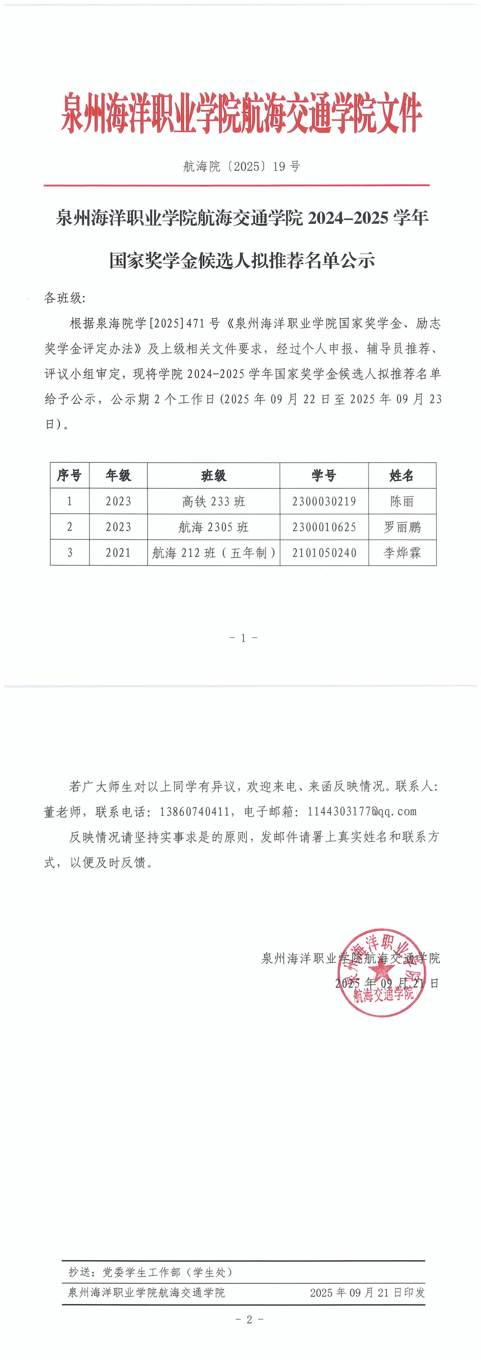 米兰官网主页航海交通学院2024-2025学年国家奖学金候选人拟推荐名单公示