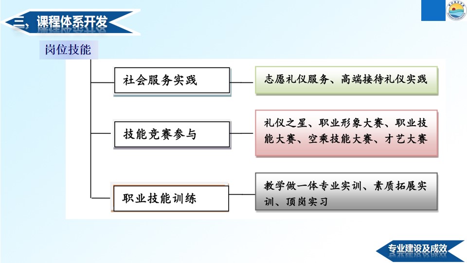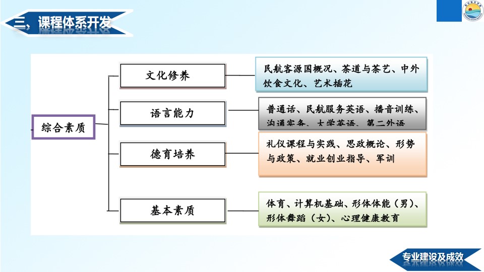 民航概论、礼仪、民航服务心理、民航服务英语、形体舞蹈、形体体能、职业形象设计、民航客舱服务、民航播音技巧、民航地面服务、民航客舱安全与应急处置、航空运输地理、客源国概况及其它茶道茶艺等气质培养课程。