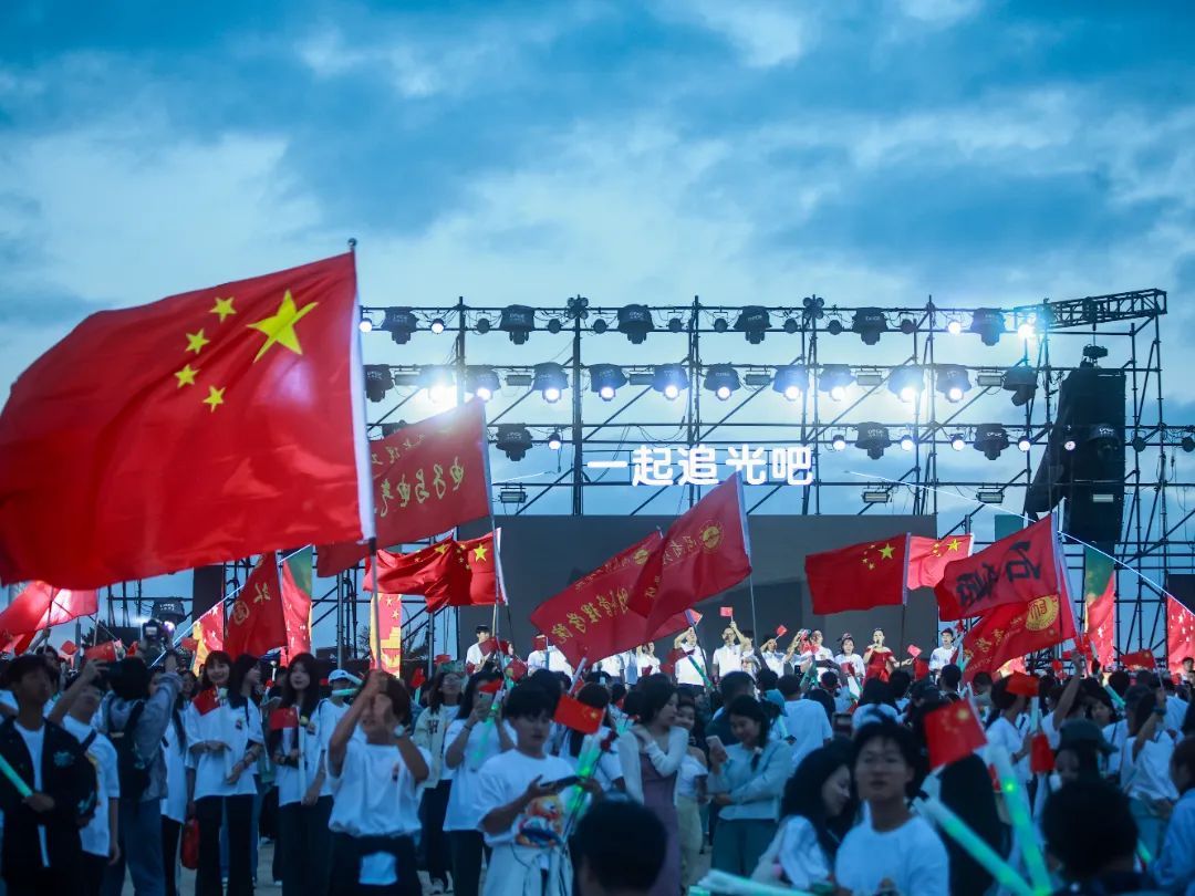 随着东方的鱼肚白渐渐泛起,天色由朦胧转为明亮,工作人员放飞和平鸽和气球。全体人员面向大海,他们手持红旗,脸上洋溢着青春的笑容。耳熟能详的《歌唱祖国》《我爱你中国》等旋律在海风中回荡,海浪的波涛汹涌成为了天然的伴奏。歌声嘹亮有力,回荡在空旷的海滩。每句歌词都充满了对祖国的热爱和对未来的憧憬,这不仅是对祖国母亲的深情祝福,也是对伟大祖国的崇高敬意。