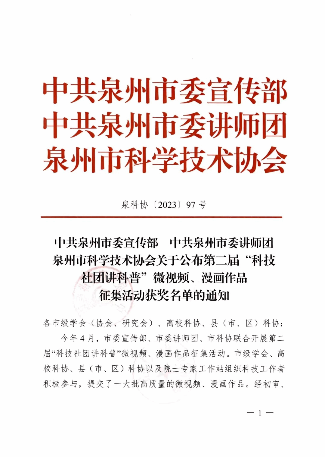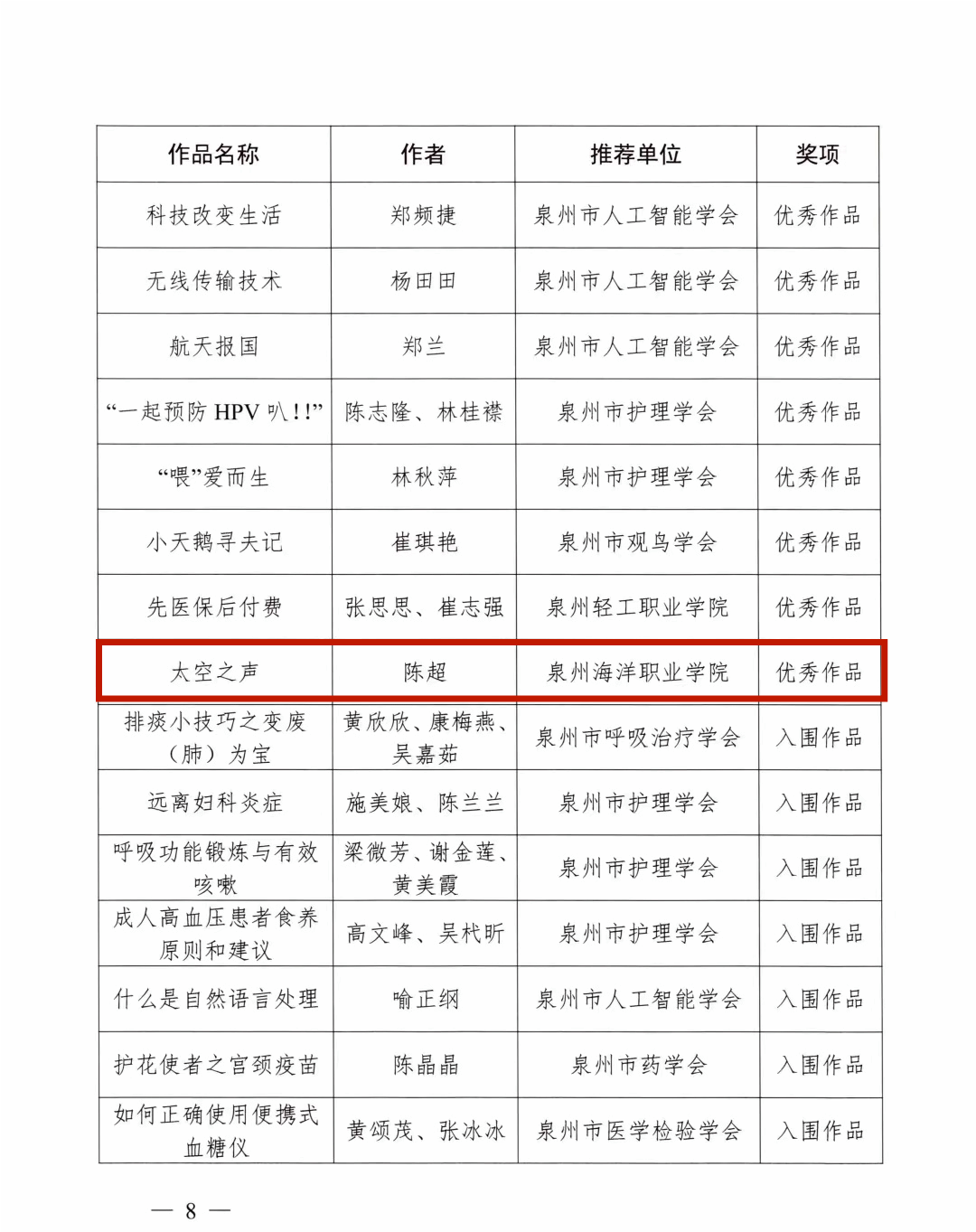 (新闻中心讯 通识教育学院刘蓉蓉供稿 校党委宣传部报道)近日,由中共泉州市委宣传部、中共泉州市委讲师团、泉州市科学技术协会联合主办的泉州市第二届“科技社团讲科普”微视频、漫画作品征集活动公布获奖名单,我校通识教育学院陈超老师的漫画作品《太空之声》获优秀奖。