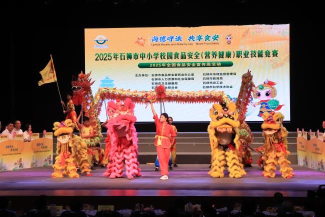 表演的高潮在最后时刻到来——绣球高高抛起,鼓点骤然加快,紫湖小学的两只“小狮子”与我校的两只“大狮子”齐齐登场,四只“狮子”围绕绣球灵活跳跃、追逐嬉戏,时而并肩腾跃,时而错落摆阵,与巨龙呼应,将现场气氛推向顶点。此次表演,充分展现了我校学生社团的蓬勃活力,也为这场聚焦食品安全与营养健康的竞赛注入了别样的文化动力。