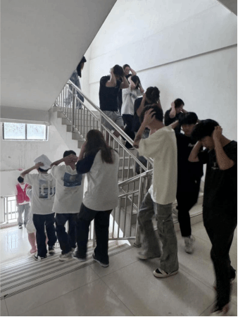 空袭警报阶段(9:25-9:27):接到撤离指令后,学生立即采取“弯腰护头”姿势,沿着指定疏散路线快速有序撤离;引导员在楼梯转角、出口等关键节点主动疏导人流,重点帮扶行动不便的同学;短短2分钟内,全体学生安全抵达地下防空室,负责人第一时间完成人数清点,实现“零遗漏、高效率”撤离。