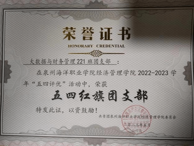 大数据与财务管理221团支部于2022年9月正式建立,团员人数8名,其中入党积极分子1名,该团支部成员不断的加强团队建设,更好的发挥先进模范作用。该团支部的同学们爱国爱党,追求进步,坚持进行政治学习,提高自己的政治觉悟;他们学习认真,刻苦钻研,积极进取,学分建设成绩突出。该支部在在经济管理学院2022-2023学年“五四评优”活动中荣获“红旗团支部”的光荣称号。