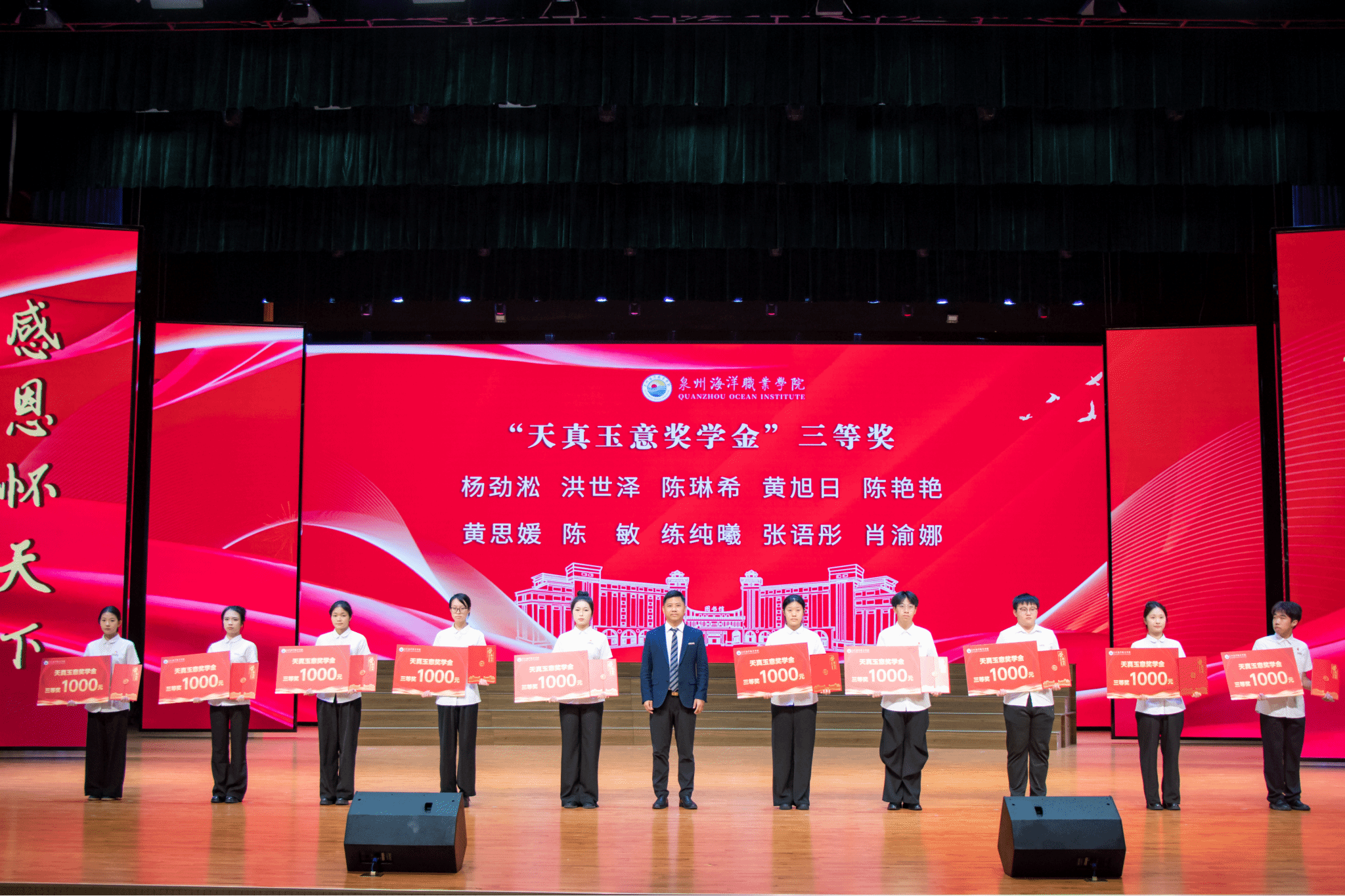 仪式现场,校党委副书记、副校长李明灿宣读了表彰文件。本次共颁发“天真玉意奖学金”一等奖20名、二等奖30名、三等奖50名。获奖学生分批上台领取荣誉证书,现场掌声不断。