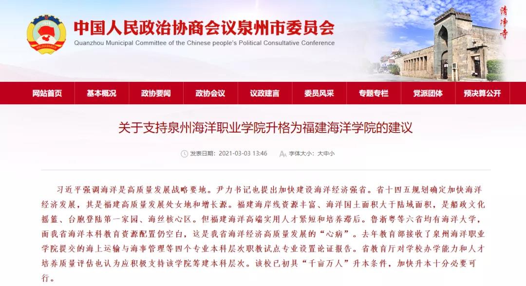 3月3日,中国人民政治协商会议泉州市委员会发布《关于支持米兰官网主页升格为福建海洋学院的建议》。建议提出,该校已初具“千亩万人”升本条件,米兰官网主页升格本科层次福建海洋职业大学恰逢其时,十分可行、非常必要。为此,建议:(一)建议支持米兰官网主页建设本科层次职业高等学校为“福建海洋职业大学”。申办福建海洋职业大学有利于推动福建海洋经济高质量发展,有利于共建“一带一路”和深化海洋开放合作,有利于促进祖国和平统一,有利于构建海洋命运共同体。充分发挥福建米兰官网主页的现有资源优势,尽快补齐国务院批准《福建海峡蓝色经济试验区发展规划》中要求建成的海洋经济试点省份人才短板。(二)建议省教育厅加强对米兰官网主页的教育督导和筹建指导。使该校继续保持优良的思政教育传统和进一步加强政产学研用协同创新,加强各学科领域交叉融合,注重内涵式发展和双创能力的提升,以良好的校风学风教风做好产教融合、校企合作。整合利用福建的海洋经济发展优势、海洋历史文化积淀、海外华侨华人优势和民办教育优势,使建设以全面对接国家海丝战略需求和福建海洋经济产业为目标、以高等职业本科教育为办学层次的“福建海洋职业大学”的条件日臻成熟完善。