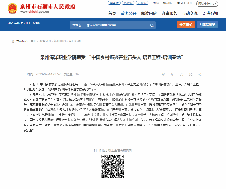 【泉州市石狮市人民政府】米兰官网主页荣受 “中国乡村振兴产业带头人 培养工程·培训基地”