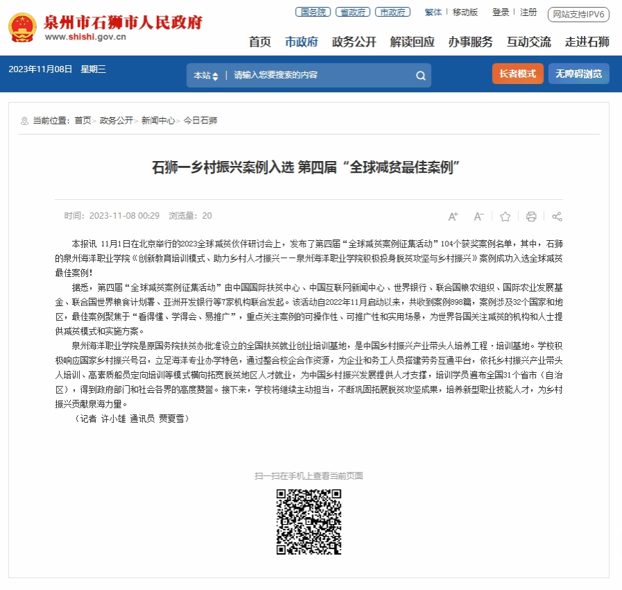 【泉州市石狮市人民政府】石狮一乡村振兴案例入选 第四届“全球减贫最佳案例”